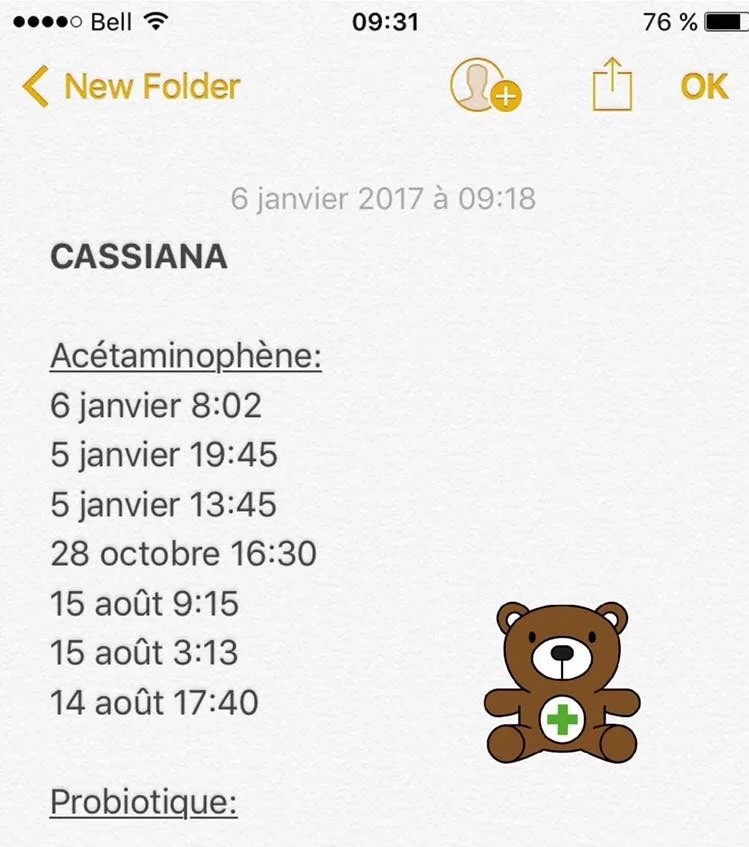 đđœ Jâai rarement du papier et un crayon Ă portĂ©e de la main. Par contre, mon tĂ©lĂ©phone intelligent nâest jamais trĂšs loin.đ± Pour un mĂ©dicament Ă donner au besoin, jâinscris la date et lâheure dâadministration dans lâapplication Notes de mon iPhone. Tout simplement! đ Jâai une note dĂ©jĂ prĂ©-identifiĂ©e pour chacun de mes enfants. Le moment venu, j'inscris l'information au bon endroit et le tour est jouĂ©! Selon moi, les applications Ă©laborĂ©es Ă cet effet complexifient cette tĂąche et comportent dâinnombrables fonctions qui me sont inutiles. Dâailleurs, elles sont presque toutes payantes. Bref, aucunement nĂ©cessaire! đ€